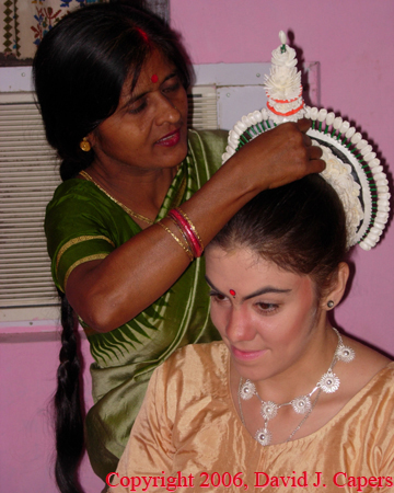 Chapala Mishra helping Ruth prepare for the performance. Chapala has been an Odissi dancer for many years. Her gentle kindness always has a calming influence.